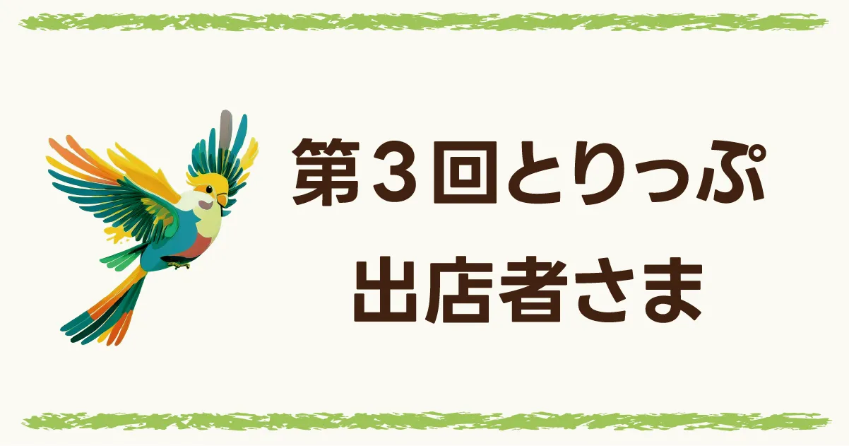 第3回とりっぷ出店者一覧 2026 2/14 お知らせ 2026年2月14日 お待たせいたしました、第3回とりっぷの出店者さまを発表いたします! ※現時点今回も全国各地からたくさんの出店者様にエントリーいただきました! グッズブース SAKURAart ちゃちゃ丸Finch さえずりの丘 時雨 とりや うちのこ似顔絵・Yuka ハムラビ商店 POCHI HOUSE ハミングバード ことり食堂 MofuRug Linohana Prince HOSHI☆ カリン インコ柄布小物みくちぇりの店 okameworks 自然探索部 アトリエお気楽 チャーム ことのわ 生体ブース Mbirds ことり専門店 リトルフェアリー Smallちこちこ 弘電舎家禽部 サッちゃん’ち BearsFrog メーカーブース HOEI SANKO Bacca style VETAFARM(ベタファーム) Versele-Laga(ヴァーセレ・ラガ) 日本生菌研究所 ナチュラルペットフーズ forbird (フォーバード) エル商会 学び・相談ブース 動物病院キバタン王国 NPO法人ことりのおうち アニマリ ことり図書館 出店者一覧 詳細はこちら 会場MAPはまた後日に発表いたします🐤 お知らせ Linohana